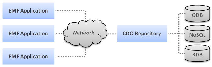 The architecture of a CDO application is characterized by its mandatory dependency on EMF, the Eclipse Modeling Framework. Most of the time an application interacts with the object graph of the model through standard EMF APIs because CDO model graph objects are EObjects. While CDO's basic functionality integrates nicely and transparently with EMF's extension mechanisms some of the more advanced functions may require to add direct dependencies on CDO to your application code.