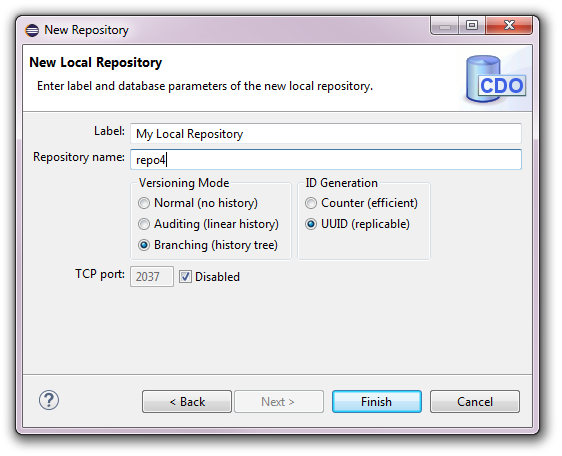 The versioning mode determines whether the history of changed models is preserved (for example to be used in Online Historical Checkouts and with the CDO Time Machine View) and whether branches are supported. The versioning mode of the repository can not be changed anymore, once the repository is created.