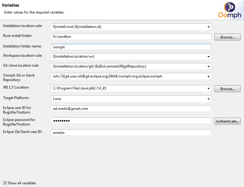 In this case the installation will end up in the 'D:/sandbox/oomph' folder.